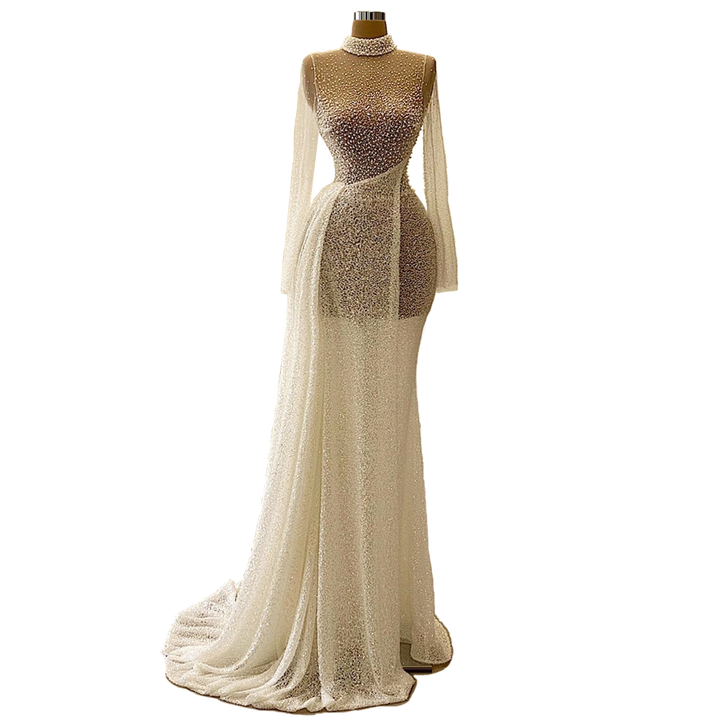 2020 Giảm Giá Mạnh Phun Vàng Trong Suốt Tay Áo Dài Tulle Ngà Evening Dress Cộng Với Kích Thước